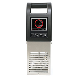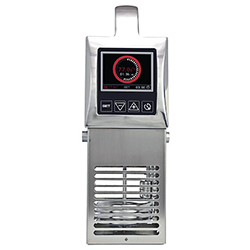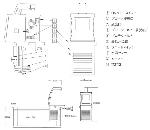 ■特長 優れた温度精度(+0.1℃)と温度ムラを生じさせない撹拌機能を有し、食材の質を維持しながら、味と風味を高めてくれます。メニューの幅が広がり、低温調理には欠くことのできないアイテムです。 ケータリングに適したコンパクトデザインで、取り回しに便利な持ち手を装備し、M2775V-6Aは外装に食品衛生法に対応したポリアミド(ナイロンの一種で、耐熱、耐衝撃性に優れる)を採用、M2775V-8Aは鏡面仕上げのステンレスを使用し、見た目にもこだわりを持たせたデザイン性の高い仕上がりになっています。 水位が最低ラインを下回った時は、加熱防止の安全装置が働き、ヒーター、攪拌モーターへの電流を遮断し、水量不足の警告表示と共に、アラーム音でも知らせてくれます。 ■各部名称&外寸図 ![]() ■仕様