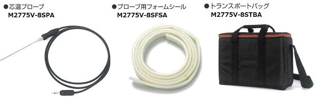 ■オプション ![]() ●芯温プローブ M2775V-8Aの専用接続口に接続する事で、食材の芯温を表示させることができます。(M2775V-8A専用) ●プローブ用フォームシール 真空パック内の食材の芯温を計測する時、このフォームシールを使用すれば、パック内に空気が入るのを防ぐことができます。(M2775V-8A専用) ●トランスポートバッグ 全面に緩衝材が封入されており、移動中の外部からの衝撃を防いでくれます。未使用時の収納ケースとしても、ご利用いただけます。(M2775V-8Aは標準付属) | ||||||||||||||||||||||||||||||||||||||||||||||||||||||||||||||||||