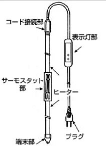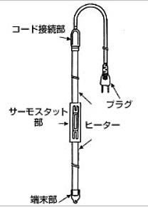 ●ヒーターの端末部、サーモスタット部、コード接続部はビニタイ又はビニルテープ等でとめて下さい。