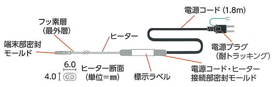 | ■樹脂管には特におすすめ。 ヒーター表面にフッ素樹脂を採用しているため適度な固さで途中で折れにくく、滑らかでひっかかりません。 ■アース付きのスリムなヒーター ヒーターが細く施工が容易です。 アース線付き(金属編組線付き)なので、万一の時の安全性が更に向上しました。 ■電源コードは1.8m。 施工現場での電源コードが楽々届きます。 ■使用用途 架橋ポリ管、ポリブデン管、塩ビ管 銅管をはじめ、様々な水道配管に使用可能 ■取付方法 ●保温材を取り付けて使用してください。 ●保温材、結束バンドは市販品を使用してください。 ●ビニールテープやガムテープなどでヒーターを固定しないでください。 ![]() ■構造図 架橋ポリ管に通しやすいよう、ヒーターはスリムで、表面はフッ素樹脂加工がされています。 端末部先端も、施工性を損なわない形状になっています。 ![]() ■(架橋ポリ管挿入例) ![]() ■エコキュート使用例 エコキュートのヒートポンプ配管にも使用できます。 ![]() ■仕様・定格
