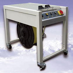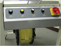操作性・耐久性を追求 荷物をテーブルに置きバンドを差し込むだけで梱包できる手軽な梱包機 操作性・耐久性を追求したユニークなデザインの半自動梱包機 |