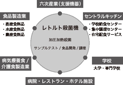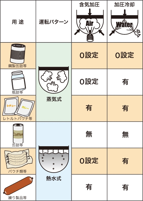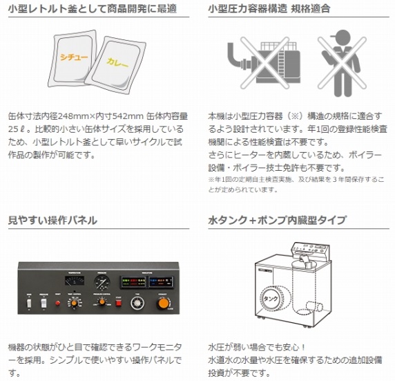 ■特徴![]() ■ゆきとどいた安全設計 オペレーターの安全確保 ●内圧対応式フタパッキン 通常の使用状態において、缶体内の圧力が高いほど密閉力がます内圧対応式です。 ●漏電ブレーカー 電気系統の異常を素早くキャッチし、故障(漏電)などによるオペレーターの感電を防ぎます。 ●空焚き防止装置 缶体内の水量を電気的に検知。水量不足時にはヒーターへの通電がカットされ、操作パネル上のワークモニターに「低水位」が表示されます。 ●重力式安全弁 缶体内の圧力が異常上昇した場合に作動し、圧力を低下させ、オペレーターを危険から守ります。作動状態が前面から容易に確認できます。 ●冷却水タンク安全弁 冷却水注入用の水タンクにも安全弁を装備。圧力による危険は全て安全弁で回避されます。 ■基本動作 ![]() ■レトルト殺菌の代表的な運転パターン ![]() ■ご利用先 ![]() ■寸法図 ![]() ■仕様
