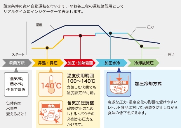 含気滅菌や加圧冷却が可能なオートクレーブです。圧力制御方式では難しいレトルト殺菌に最適です。 |