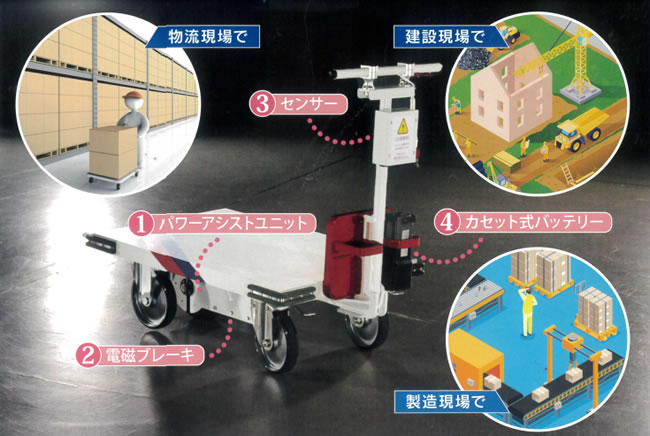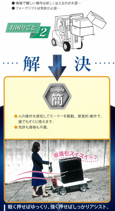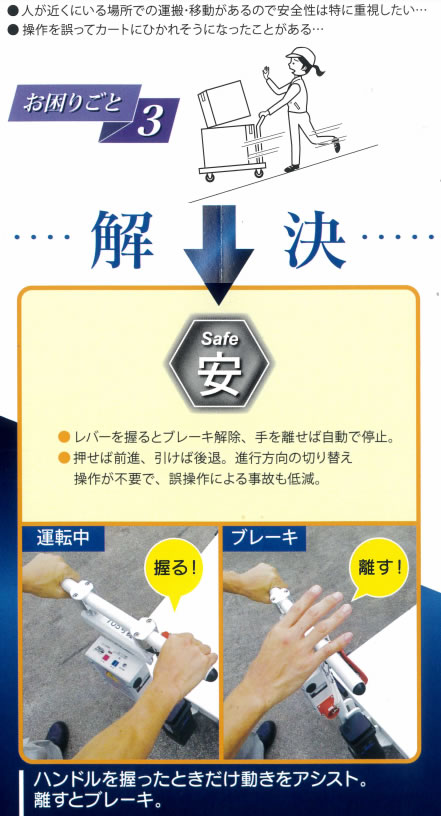 ●小さな力で大きな荷物 ●疲労の軽減 ●感覚的操作で誰でも使える ●免許不要 ●手を離せば自動停止 ●誤操作による事故の低減 |