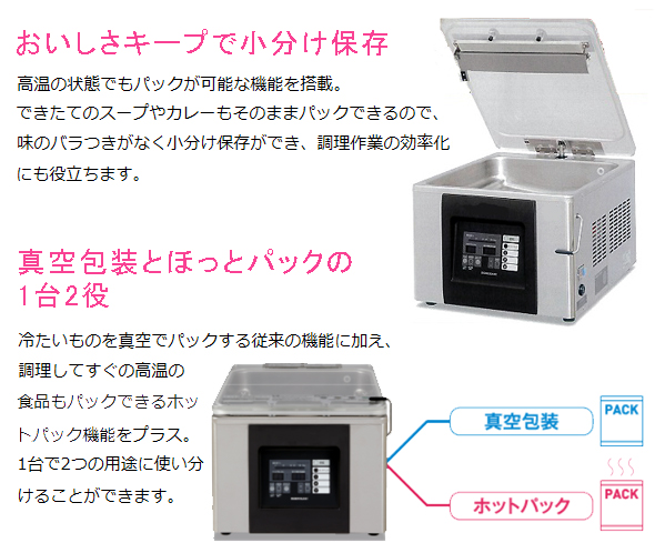 出来立てアツアツもそのままパック可能な、誰にでも扱いやすい真空包装機です 。