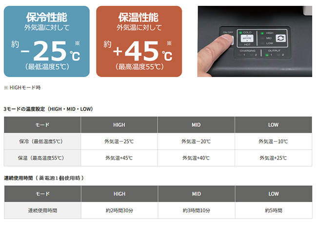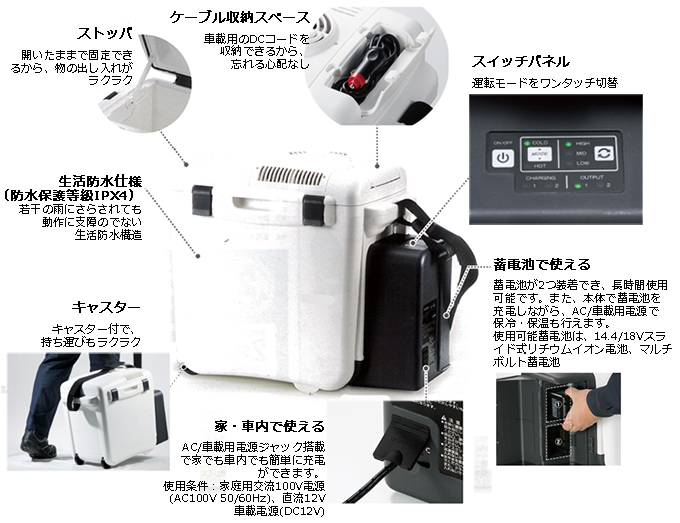 | ■特長 ●保冷・保温機能パワーアップ 3モードで細かく温度設定 ![]() ![]() ●3電源対応でどこでも使える(蓄電池、コンセント、車載電源) ![]() ■仕様