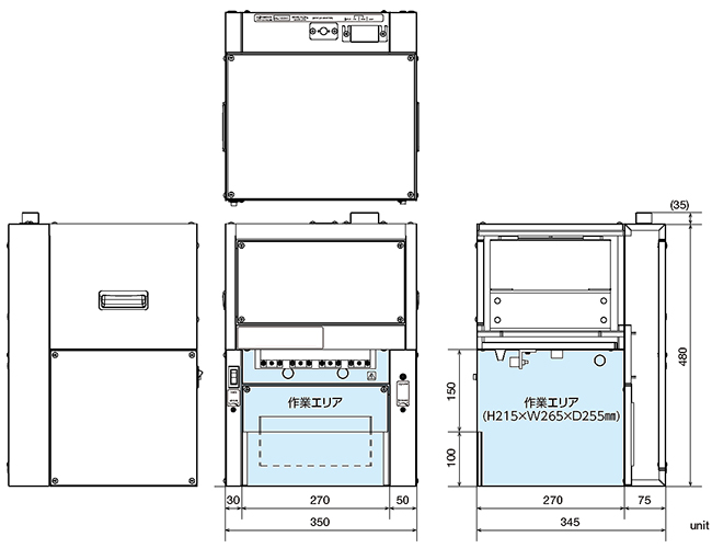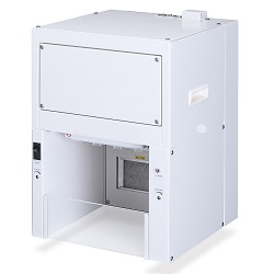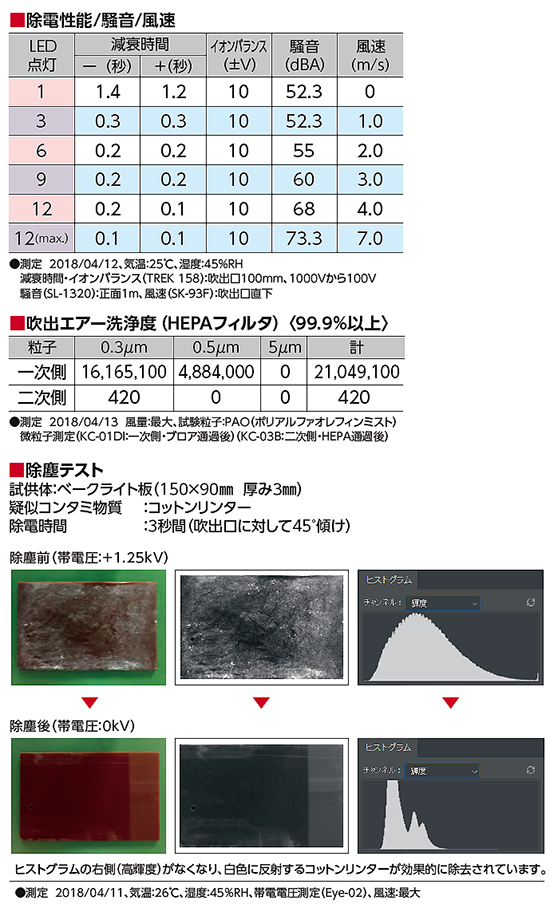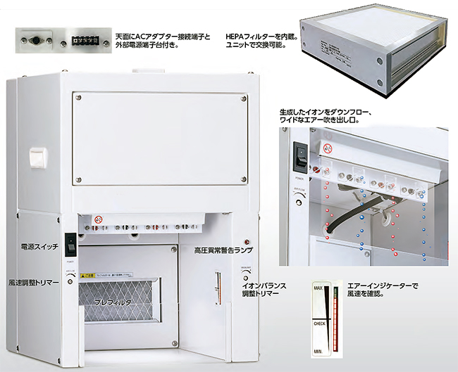 ■特長 ●ブロアエアーをHEPAフィルタでクリーン化 0.3μm以上の粒子を99.97%除去したクリーンエアーを吹き出します。(最大:約25m/sの風速、1.5m3/minの風量) 手前のアクリルカバーでエアーの拡散を防止します。 (取り外し可能) ●DCイオナイザー搭載、除電エリアを作ります 幅270×奥行270×高さ250㎜の空間が「無帯電」に。 イオンバランス調整、針電極の交換が可能です。 高電圧異常を知らせる警告ランプ付き。 ●エアーブローの風速調整が可能です 風速の大小が12段階のLEDインジケータで表示され、HEPAフィルター交換の目安にもなります。 最小にするとほぼ無風の状態が作れますので、飛散を嫌う粉体の作業にもお使いいただけます。 ●LED照明 運転ランプ兼用のLEDランプで手元を明るく照らします。 ●壁面にピッタリくっつけて置けます 装置背面に突起や電源端子をなくしました。狭い作業台を有効に使うことができます。 ●エアー循環式で外部への排気がない ブース奥のプレフィルターから吸引されたエアーは内部のブロアを通り、HEPAフィルターでろ過されてブース天面から再び吹き出します。 ![]() ■使用例 ![]() ■性能データ ![]() ■仕様
