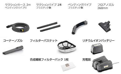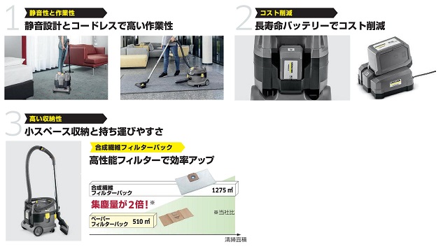 ■特長![]() ●静音設計とコードレスで高い作業性 62dBの静音設計で営業時間内に清掃が可能です。電源確保や移動の度にコードの差し替えが必要なく、場所を選ばず手軽に清掃できます。また、コードをお客様の足や装飾品に引っ掛けてしまう心配もありません。 ●長寿命バッテリーでコスト削減 搭載のリチウムイオンバッテリーは約1,200回充電可能です。ニッカドバッテリー(充電回数300-500回)と比べ長寿命で、バッテリー交換のコストを削減します。充電時間は60分で、エコモードで60分、パワーモードで24分使用できます。 ●小スペース収納と持ち運びやすさ 本体以外の装備品を本体に収納・固定できるため、コンパクトに収納できます。また、片手で持ち運びができるため、移動や階段も両手がふさがらず安全です。 ●高性能フィルターで効率アップ メーカー従来の紙製フィルターバックに比べ集塵力が高く、約2倍(メーカー比)の清掃面積を誇ります。また、ゴミ捨て回数が減ることでランニングコストも削減できます。 ■用途 ![]() ■標準装備 ホース・コード類の長さに関して、実寸を±5%の範囲で設定しております。 ![]() ■仕様