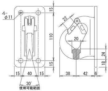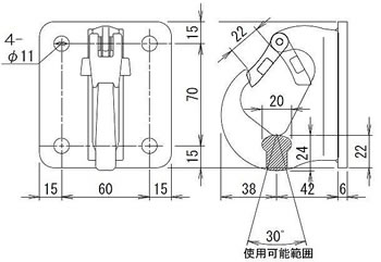 ◆注意 ●M10 のボルトナットで確実に取り付けてください。 ●取り付け用ボルトナット等は付属しておりませんのでお客様でご用意ください。 ●適宜平ワッシャやスプリングワッシャを使用し、緩み止めにもご留意ください。 ●ラッチには負荷しないでください。 ●変形や破損、事故につながりますので上図の角度の範囲内で使用荷重を守ってご使用ください。 ■固定式フック用ラッチキット(M400HL-1H) ラッチ、バネ、ピンのセット |