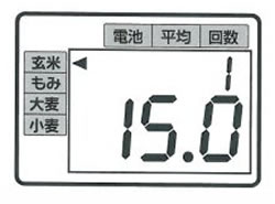 | ■特長 ●見やすさ 水分計として従来にない大きな液晶パネルでくっきり見やすくなりました。 ●平均 2~9回までの平均値が、ボタンを押すだけで簡単に読みとれます。 ●簡単操作 ボタンの数をできるだけ少なくして、ボタンの押し間違いをなくしました。 ●選択 ワンタッチで、玄米・もみ・小麦・大麦が選択、直接表示されます。 ■表示部 ![]() ●液晶(L.C.D.)は、電池寿命にすぐれています。 ■付属品