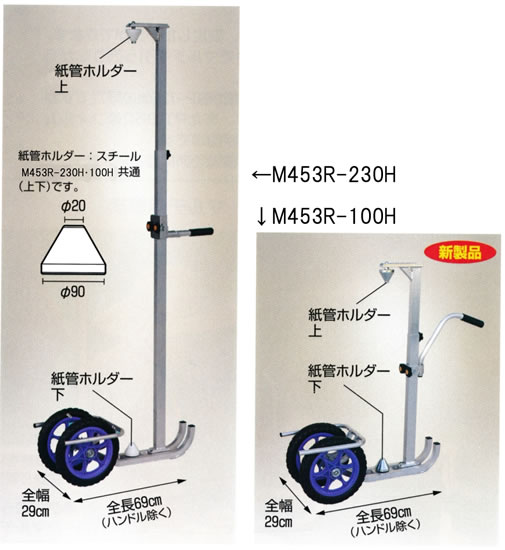 | ■特長 ●フィルムを台車にセットしてくり出せばハウス側面のフィルム張り作業が楽におこなえます。 ●紙管ホルダーが回転しますからスムーズにフィルムをくり出せます。 ●二人作業の場合には一人が台車を引きながらフィルムをくり出し、他の人がパッカーで止めていけばより早く作業できます。 ●M453R-100Hは裾張用です。 ■タイプ ![]() ■仕様