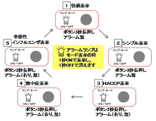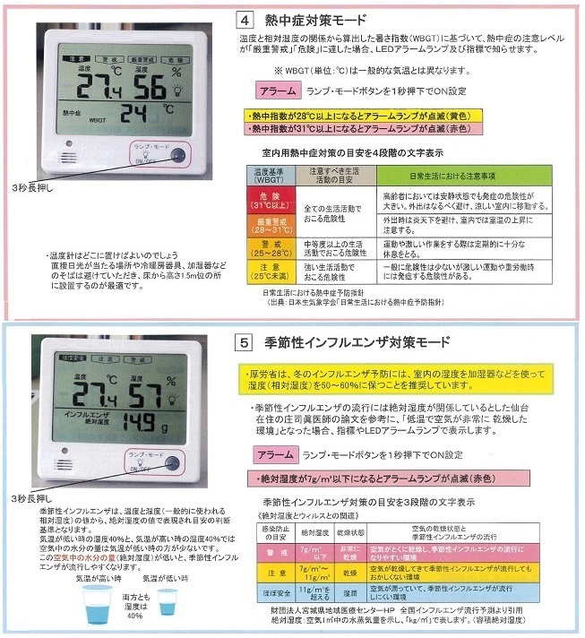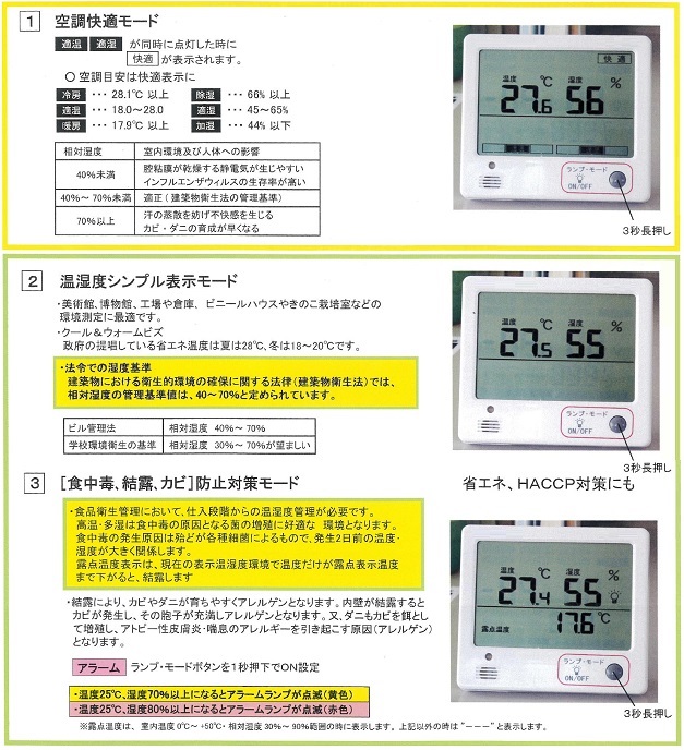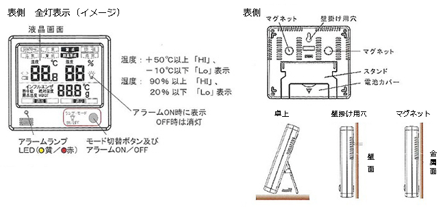| ■特長 ●快適温湿度や食中毒、熱中症、季節性インフルエンザの予防目安を指標やアラームランプでお知らせ ●視認性の高い液晶画面(90×60mm) ●文字高さ17mmで見やすい数値 ●壁掛けやスタンドで使用可能 ![]() ●使用目的に合わせたモード切替が可能 ![]() ■各部説明&設置方法 ![]() ■使用場所例 ![]() ■各モード ![]() ![]() ■仕様