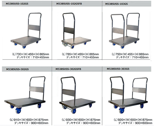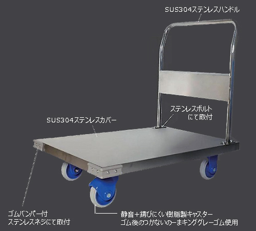 静音樹脂台車の軽さ、静かさとステンレス(SUS304)の防錆性の高さを併せ持つハイブリット台車です。 ![]() ■特徴 ●SUS304カバー&ハンドル+樹脂台車 ●環境基準AA地区40dbをクリア ●ハンドル・デッキ・キャスターすべて国内製造 ![]() ■タイプ ![]()