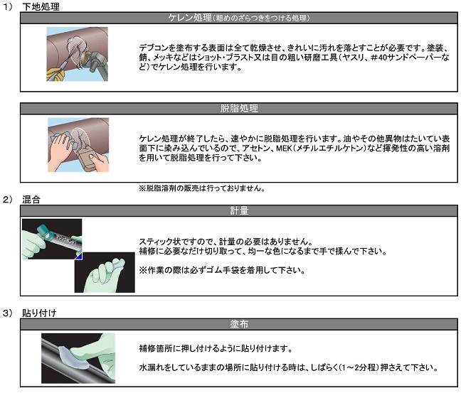 スティック状ですので計量の必要がなく、必要なだけ切り取って、揉んで、貼りつけるだけで簡単に補修ができます。