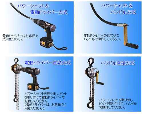 | ■特長 専用パワーシャフト(1.5m)に充電式電動ドライバーをつなぐだけで、遠隔操作による電動の巻上げ・巻下げ作業が手軽に行えます。 ハンドチェーンを使わず、遠隔操作が行えますので、狭小や低空頭な場所でも、スムーズな作業が行えます。電動ドライバーをご使用にならない場合は、手動ハンドルによる駆動でもご使用いただけます。また、パワーシャフトを介さず電動ドライバーを使って、本体に直接入力させることもできます。380kgのみロングライフチェーンを使用しています。 ■タイプ ![]() ■4種類の駆動方式 ![]() ■仕様
