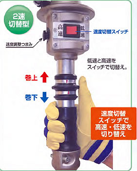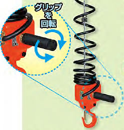 | 小型・軽量・高性能のパワフルマシーン 作業性を追求するダイレクトハンド グリップを回して操作するアクセルグリップタイプに加え、グリップをスライドさせて操作するスライドグリップタイプが仲間入り。 まるで吊り荷を直接もって動かしている様なダイレクトな操作感。 組み立て作業や治具交換、型合わせ作業にオススメのダイレクトハンドシリーズでさらなる作業効率をご提案します。 ![]() ■特長 ●グリップ操作に連動するダイレクト感 上下の矢印表示が付いた可動グリップを上下へスライドさせることで、吊り荷も上下するシンプルでダイレクトな操作感。 ![]() ●握り易さ抜群で滑りにくい 固定グリップにエラストマー樹脂を採用し、握り易さは抜群。 滑りにくく疲れにくい。 水平移動の際※にも威力を発揮します。 ※横行トロリ仕様の場合 ![]() ![]() ■誤操作防止 速度切替スイッチ周辺には凹凸があり外部からの接触・衝突による意図しないスイッチ操作や、スイッチの破損を防ぎます。 ■不要な変速を防止 2速選択型には「高速OFFスイッチ」が付いており、慎重を要する低速運転作業時には「低速」へ切替ることで不要な高速運転への変速を確実に防止します。 ![]() ■安全でスムーズな回転 下フックはスラストベアリング内蔵で安全かつスムーズに回転します。 ※下フックの脱着機能はありません。 ![]() ■作業に合わせた速度調整 ボリューム式の速度調整つまみが付いており、作業に合わせた速度設定が可能。 ※2速選択型、2速切替型の速度調整は「高速」時の調整と「低速」時の調整となり、1速型では「巻上」時の調整と「巻下」時の調整となります。 ●1速型:巻上速度は一定。ボリューム式速度調整つまみでの速度調整は可能。 ■寸法図 ![]() ![]()
