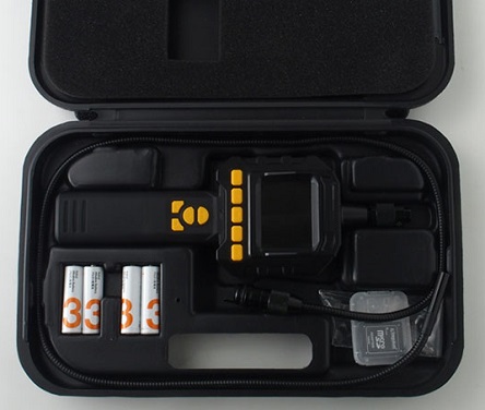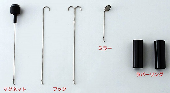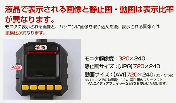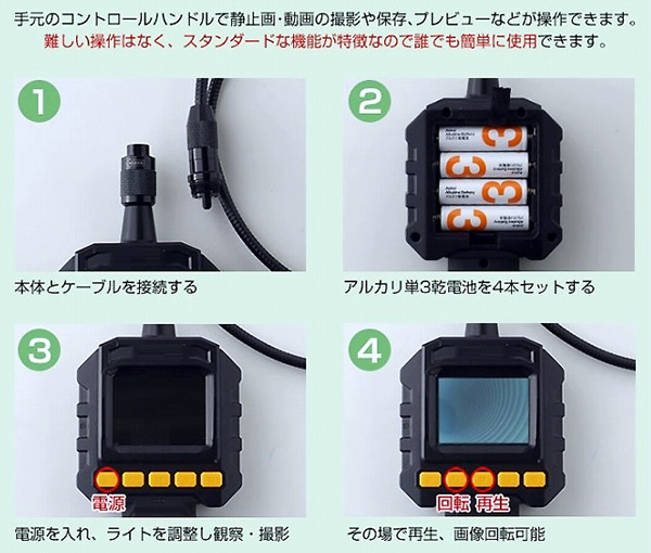 | ■特長 ●エンジンや機械などの複雑に入り組んだ狭い隙間や、配管、高所にあることが多い空調機器、換気扇の内部など、直接見ることが難しい場所でも、この内視鏡がとらえた映像を手元のモニタに映し出し確認することができます。 ●水気のある場所でも使えるIP67の防水仕様 ●調光可能なLEDライト搭載 先端部にLEDが4個搭載されており、8段階の調光が可能です。 ![]() ●映像を静止画・動画撮影、保存可能 見ている映像を約35万画素で撮影・保存ができます。報告書などの資料作成に使用できます。 ●microSDカード(2GB)付 静止画であれば約300枚の画像が保存できます。またmicroSDカードに保存した画像をパソコンなどにデータを移したい場合に便利なSDカードアダプタも付属しています。 ●画面の映像を回転させて確認することができるので、カメラの向きを変える手間がなく、画像を見やすく表示できます。 ![]() ●本体+ケーブル(8mm径・1mタイプ)+電池を含む重さが約450gと軽量 ●2.3型モニタ ●シンプルな機能のみを搭載。電源・撮影・再生・映像回転など4種類の操作のみで誰でも簡単に使用できます。 ![]() ●4種類のアクセサリが付属 ![]() ■構成 ![]() ■仕様