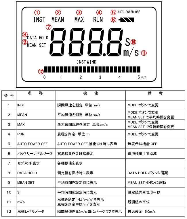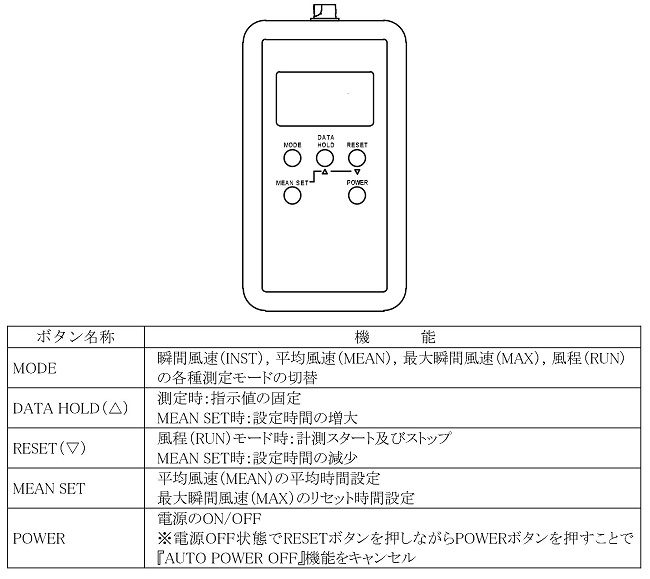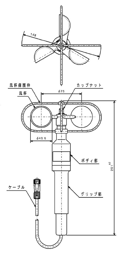 瞬間風速・平均風速・最大瞬間風速・風程の各種風速要素を測定できる、ポータブル指示風速計です。 |