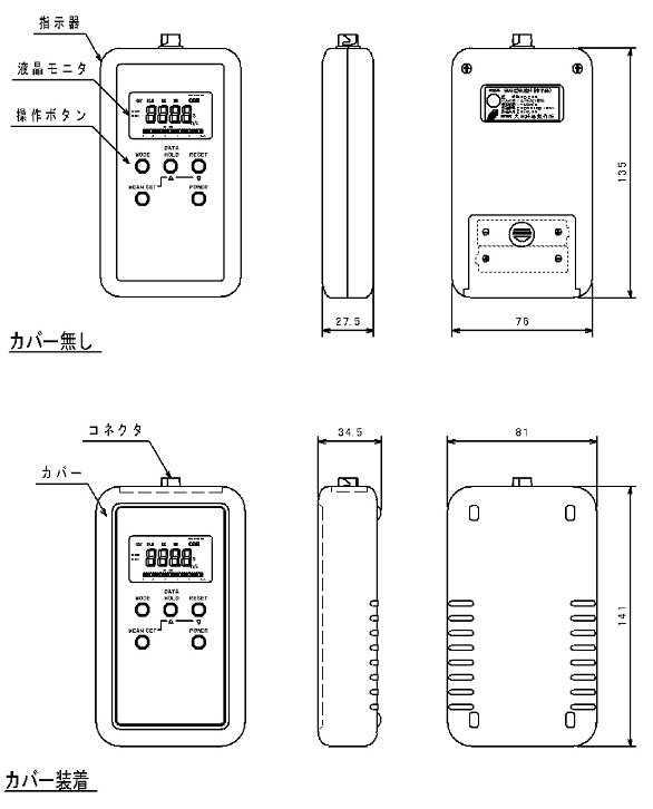 | ■特長 ●発信器は風杯変形防止用の保護枠付きです。 ●別売の延長ケーブル使用で屋上-事務所などの遠隔測定が可能です。 ●瞬間風速・平均風速・最大瞬間風速・風程の測定が可能です。指示器「MODE」ボタンを押すごとに表示が切り替ります。 ●平均風速時間、最大瞬間風速リセット時間は1~600秒(10分間)で、1秒単位で任意に設定可能です。また一度設定すれば電源を切っても保持されますので、電源ONごとに設定する必要はありません。 ※平均風速時間、最大瞬間風速リセット時間は同じになります。個別の設定はできません。 ■寸法図 ■仕様