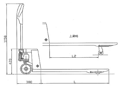| ■特長 ●人にやさしい樹脂製ハンドルを使用 ●過負荷防止装置付の油圧ポンプを採用 ●下降スピードをレバーの握り加減にて調整可能 ●板厚4.5mmの強力フォーク材を使用 ●全車輪にホワイトウレタンタイヤ装備 ●パレットの抜き差しがスムーズな大型ガイドスキーを装着 ●パーキングブレーキ全車標準装備(業界初!) ■寸法図 ![]() ![]() ■車輪