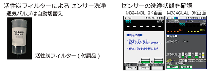 (高濃度警告:センサ保護、バッテリー残量警告) |