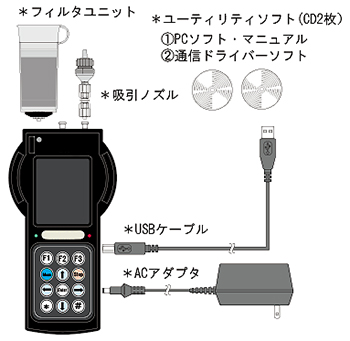 吸引フィルタろ紙×10枚、ピンセット、密栓用キャップ×3ヶ、ACアダプタ×1ヶ、