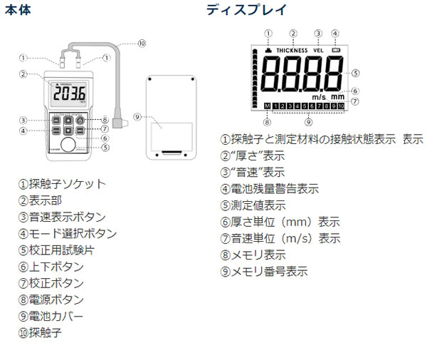 金属から非金属まで様々な物質の厚さ測定が可能。![]() ■特長 ●探触子を対象物に当てて測定します 探触子から出力された超音波が測定物に入射し、反対面で反射して戻ってくる時間(伝搬時間)を測定することで厚さを算出します。 ![]() ●金属加工品の仕上げ厚さ検査、配管・鉄板等の腐食検査や、ノギスやマイクロメータで測定が困難な箇所の厚さ等を簡単に測定することが可能です。 ●暗所での使用に便利なバックライト付きLCD搭載。 ●電池の消耗を抑えるオートパワーオフを搭載。 ●持ち運びに便利なケースも付属。 ![]() ■各部名称 ![]() ■仕様 ●電気的性能