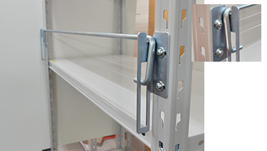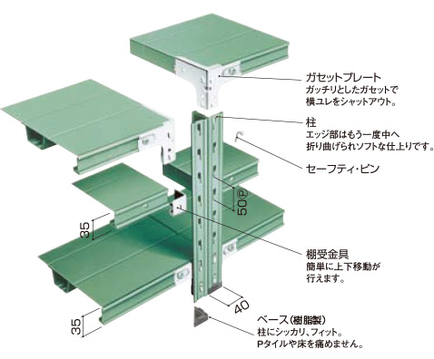 ■オプション ●落下防止バー 積載商品の落下防止に ・ワンタッチで上下に動かせ、スムーズな出し入れが可能。 ![]() ●転倒防止金具(取付けボルト別途) 壁面、床面への転倒防止対策用金具です。 ![]() ●連結金具(4ケ入り) 隣り合う支柱を抱き合わせハメ込みにより連結します。 ボルトを使用しないので手軽に連結出来ます。 ![]()