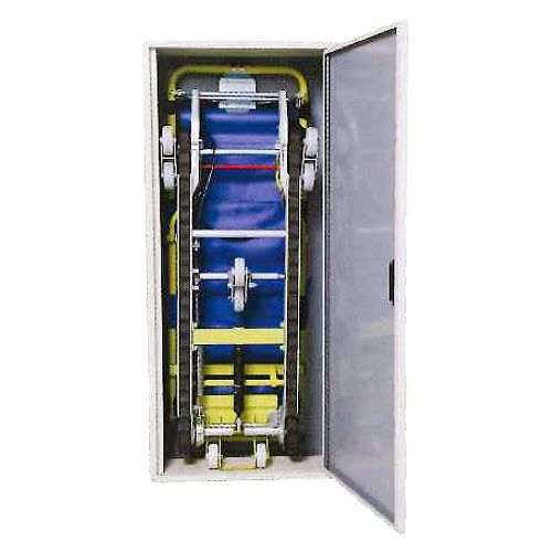| 地震、火災などの災害時にエレベーターが使えない状況下での歩行困難の方を乗せ、通路・階段を安全に避難させることができます。 介助者がハンドルから手を離せば階段の途中でも自動的にブレーキが働き、その場で駐車が可能です。これは災害により崩れ落ちた障害物が階段にあったり、殺到した一般の避難者への追突・接触等、通常ではない状況においての2次災害の防止には必要不可欠。災害時、歩行困難者の階段避難をサポートします。 ※降り専用です ![]() ■特長 ●最大荷重180kg ●特殊設計のゴムクローラはどんな素材の階段にも対応 ●専用キャビネット(別売)から取り出し、折りたたみ状態からワンタッチで搭乗可能 ●階段下降中はブレーキレバーでスピード調整が出来ます ●階段下降速度はオイルダンパーで制御されるので加速せず一定スピードで下降 ●ブレーキシステムにより階段上でも停止可能 ●ハンドルレバーから手を離せばその場で停止 ●新規にヘッドバンド・補助ハンドルを標準装備 ![]() ■用途 地震・火災などの災害時の避難に ■踊り場の許容寸法 ![]() ■仕様