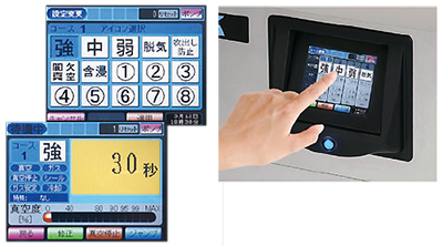 ■特長![]() ①選べる4シール方式をご用意 食材や商材に合わせて最適なシールタイプを選ぶことで、ムダのない効率的な運用を実現します。 ![]() ②タッチパネルによる簡単な操作性 ・ひと目でわかる大きな文字・絵表示 15種類のアイコン一覧から選択でき、文字入力も可能です。 ・コース設定もワンタッチで変更可能 真空時間(秒)と真空圧力(%)もワンタッチ切り替え。12のコースが選択できます。 ・見やすい操作画面 どんな角度からでも見やすいTFTカラータッチパネルを採用しました。 ![]() ③取っ手がついて開閉が楽々 チャンバーの開け閉めが、作業する人を選ばず容易に行えるよう配慮しました。 ④3つの窓で、視認性を高めて安心 運転中も包装物をチェックしやすい大型窓を装備。吹きこぼれや袋のズレも細かく確認できます。 ※「MD33V-1041T」のみ2つ窓になります。 ⑤チャンバーは傾斜角度が5段階で調整可能 長時間の作業でも負担を軽減できるよう、使いやすい角度に設定できます。 (角度調整は「0度、5度、10度、15度、20度」の5段階になります。) ※傾斜可能機種は「MD33V-1041T、MD33V-1041DT」のみになります。 ![]() ⑥ヒーターブロックのコードレス化 ヒーターブロックがコードレスになったことで、掃除がしやすくなり衛生的になりました。 ⑦仕上がりの完成度を高める、多彩なプログラム ・吹きこぼれなどのトラブルを防ぐため、真空・真空開放を繰り返す「吹きこぼれ防止機能」 ・真空中の急激な袋のふくらみを抑え、商品ロスを防ぐ「間欠真空機能」 ・速度を落として袋を開放し、シワを防ぎきれいな仕上がりを実現する「ソフト開放機能」 ・真空引き、ガス封入を繰り返し、置換率の安定した包装を実現する「ガス反復機能」 ・食材を柔らかくする介護食の新調理法 「凍結含浸調理」対応のプログラム搭載 ・オイル交換時期、ヒーター断線、機械の異常発生状況を知らせ、安心して作業ができる「メンテナンス通知機能」 ■外形寸法 ![]() ■仕様