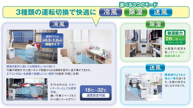 ![]() ![]() ●便利な入/切タイマー付き 1時間~24時間(1時間単位で設定可能) ●ノンドレン構造 冷風運転時、面倒な水捨ての必要がありません。 ※使用環境によっては、排水が必要な場合があります。 ※除湿運転時はドレンホースを使用する必要があります。 ●風向き調整可能 上下、左右に風向きルーバーの調整可能。(手動) ●リモコン付き 離れた場所からでも楽々操作。 ![]() ■寸法図 ![]() ![]() ■仕様