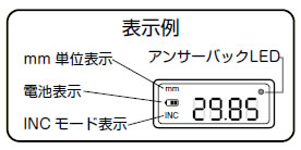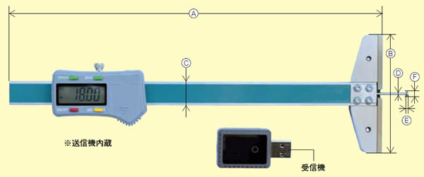 | ■特長 ●データ送信距離は見通しで約5m。 ●アンサーバック方式採用。 ●送信機はデジタル表示部に内蔵されております。 ●受信機はノギス本体に1個付属します。 ![]() ※附属アタッチメント(全長:80mm) 深さ測定・段差測定は附属アタッチメントを用います。 フックの下端面とアタッチメントの端面がフラットな状態になり、ゼロ「0」セットされます。 ![]() ※オプションにて全長180mmのアタッチメントもございます。 ■表示例 ![]() ■寸法図 ![]()