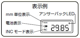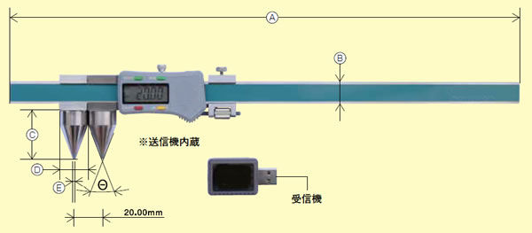 | ■特長 ●センターピッチ測定と直読で測定できます。 ●データ送信距離は見通しで約5m。 ●アンサーバック方式採用。 ●送信機はデジタル表示部に内蔵されております。 ●受信機はノギス本体に1個付属します。 ![]() ■表示例 ![]() ■寸法図 ![]()