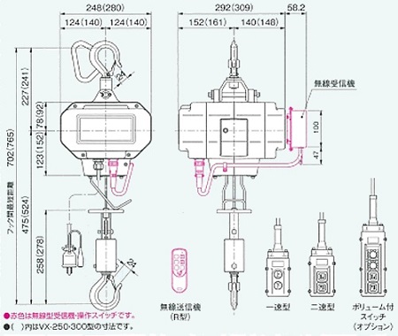 | ■特長 ●過負荷防止クラッチ内蔵 ●メカニカルブレーキとモータの発電制動の併用による確実な 二重ブレーキ ●オーバーロード警告表示付フック ![]() ●過巻防止装置及び逆巻防止装置付 ●軽量・薄型タイプ(アルミ鋳造品・合成樹脂) ●室内作業の際に便利な薄型設計 ●操作コードは10m ●便利な足場パイプ用フック(オプション) ![]() ■寸法図 ![]() ■共通仕様