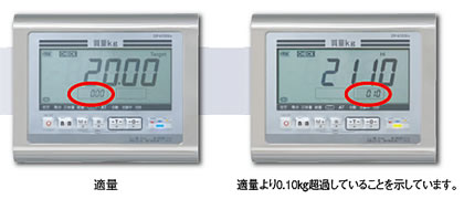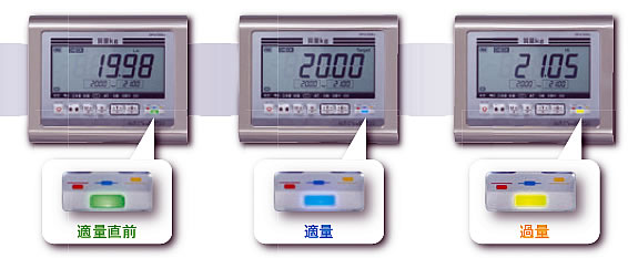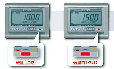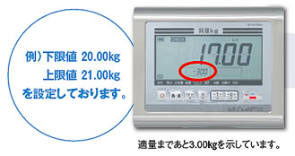| ■特長 ●手動充填時のバルブ調整が簡単 バルブ調整タイミング(バルブを閉めるタイミング)をLED表示の色の変化を見て作業ができるため、判断が容易になります。 ![]() ![]() ※適量直前のLED表示を確認したらバルブを閉めます。 ●「あと何kg?」が一目で判る 上限・下限値の設定を行うことで計量作業中の過不足量を質量または個数で表示します。 ジャスト計量機能は、あとどのくらいの量を載せれば、もしくは取り除けばよいのかを画面表示し、軽量・適量・過量の判定を3色LEDランプ(赤色、青色、黄色)で知らせます。 ![]() ![]() ●高精度かつ検定品 取引証明用(検定付)として1/6000の計量精度を実現していますので、30kg/5g・60kg/10g・120kg/20g・300kg/50gの計量が可能です。 高精度の計量は歩留改善による原料コストの削減に役立ちます。 ●本質安全防爆ロガー 質量値をリアルタイム、もしくはバッチ送信し、本質安全防爆ロガーに保存(最大5,000件)できます。本質安全防爆ロガーよりはかりに上限・下限値を送信することができます。 はかり指示計操作による設定はいりません。本質安全防爆ロガー1台で複数台のはかりの計量データ管理ができます。 ![]() ●乾電池の交換が簡単 電池ボックスを取り外して、非危険場所に持ち出すだけで乾電池交換ができます。 計量器を安全な場所に移動させて電池交換を行う必要はありません。