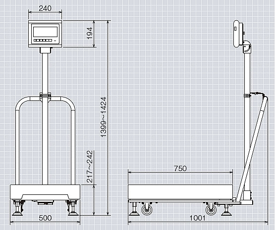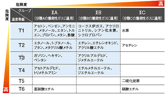 ■使用乾電池 ●パナソニック製マンガン単1形乾電池(R20P(NB))をご使用下さい。 ※国際整合防爆指針2008以降電源の乾電池は1型式・1種類に限定されました。 ■移動に便利な車輪付もご用意しています。(300kgタイプのみ) 移動に便利な車輪・手押しハンドルを取り付けたタイプもあります。 標準仕様は鉄製。オプションでステンレス製にもすることができます。 ![]() ![]() ■爆発危険性ガスの危険特性 グループ/温度等級によって表のように分類されます。 メーカーの防爆はかりは、「グループ:ⅡB」「温度等級:T4」に適合していますので、危険特性が下のランクにもそのまま適合され、■の範囲で使用が可能です。 ![]() ■外観寸法図