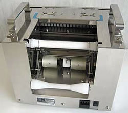 | ■ コストと在庫のカット カットフィルムに比べてコストダウン。 長さの違うカットフィルムの在庫が不要。 ■ 衛生的で作業性も向上 誰でも確実に一枚ずつ取ることが出来ます。 他のフィルムに触れることが無く非常に衛生的。 ■ 高速カット 1分間に約65枚(100mm設定時)。 フィルムを取ると次のフィルムが出てきます。 ■ フィルムの長さをデジタル設定 1mm刻みでデジタルセット。長さの変更が簡単です。 枚数、プリセットカウンター機能搭載。 ■ 安全でシャープな切り口 専用設計のハサミ式切断刃の採用によりシャープな切れ味が持続します。 通常刃の交換は必要ありません。 刃の位置が奥にあるため安全です。 ■ 湿気に強く高い耐久性 フィルムが縦方向に送り出されるので湿気の多い環境でも安心してご利用して頂けます。 主要部品はステンレス製です。 ■フィルムホルダー ![]() ■タイプ