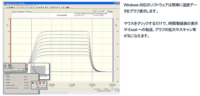 ■特長 本製品は記憶容量500,000メモリー/ 1チャンネルの膨大なメモリー数を有する、9チャンネル(内部温度1チャンネル、外部温度8チャンネル)大型LCD画面付き温度データロガーです。測定間隔は1秒間に4回からと、短い時間での温度測定を行うことが可能です。 LCD画面では各チャンネルのリアルタイム温度と最高・最低・平均値温度を数値表示するのに合わせ、電池残量、ロガーの各種設定がキー操作で可能です。温度データロガー に使用する熱電対センサーは K, J, T, E, R, S, B ,N タイプを選択できます。 ※熱電対センサーは付属しておりません。 トレーサビリティのあるNIST(+25℃/+60℃:内部チャンネル, 0 mV:外部チャンネル) 校正証明書付でお届けします。 ■ソフトウェア 測定のプログラムと温度データの読み込みは、本体とUSBケーブルで解析ソフトをインストールしたパソコンに接続します。特別な読取装置は必要ありません。Windows XP/7/8/10対応の日本語版ソフトウェアは簡単に温度データをグラフ表示します。測定データはExcelで表示することも可能です。