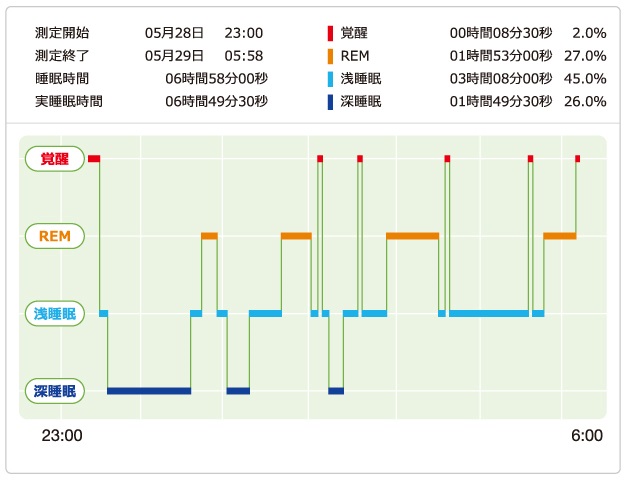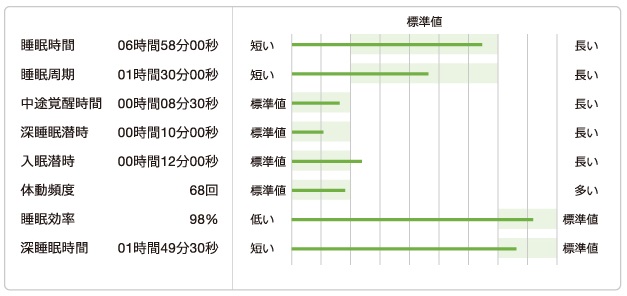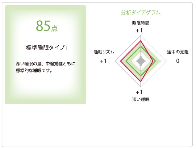 高精度体動センサーで睡眠の状態を詳しく測定します。 メーカーサイトで睡眠のタイプ判定とタイプに合わせた快眠のためのアドバイスを表示します。 |