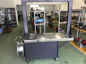 | ■特長 ●新フラップ式バンドガイドの採用 バンドの振れ、ねじれを低減し、かつ耐久性に優れたベルト、スプリング併用のフラップ式バンドガイドを採用しました。フラップの弾性によりバンドを保持しつつ引き戻しを行うため、理想的に形で梱包物にバンドを巻き付けます。 ![]() ●分割式アーチカバー アーチに前面カバーが取り外せバンドガイド部のメンテナンスが容易に行えます。 ●φ120mm大径メインローラー 従来のφ70mmからφ120mmにメインローラーを大径化したことにより、バンドが楽に通路を通る形になりバンド送り、引き戻しが安定しました。 ![]() ●バンド通路部脱着の容易化 バンド通路の部品が工具なしで簡単に取り外せ、かつ調整なしで取り付けられる構造になっています。 ●バンド終端自動排出 バンドを使い切るバンドの後端をバンド挿入口部で保持し、チャンバー内のバンドを使い切った状態でアーチ内に残ったバンドを機外に自動的に排出します。 ●バンド送りリトライ バンド送り異常が発生した場合、バンドを一度引き戻したあとに再度バンドを送ります。 ●DCブラシレスモーターによる安定した引締め バンド送り、一次締め、二次締めをDCブラシレスモーターにて行っています。 二次締力はモータの出力トルクをコントロールしていますので機械的に磨耗等による二次締力の変化はありません。 ●従来機より継承している機能 各部スイッチの近接スイッチ化、バンド自動装填、空結速時二次締OFFバンドリール部ガードバー付、φ100mmキャスター ■寸法図 ![]() ■仕様