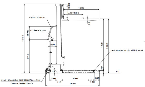 | ■特長 ●過負荷防止バルブ付き ●脚もフォークを延長し、脚巾が広いので大きな荷物を載せても安定します。 ■寸法図 ![]() ![]() ![]()