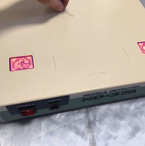 製品中にまぎれこんだ縫い針、 まち針、 ミシン針、 またはそれらの折れ針などを検出すると、 ブザーで警報を発し検出ランプを点灯します。