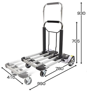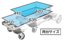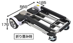 | ■概要 本製品は人が乗る部分が電動二輪車となっており、前に取り付けた荷台の荷物ごと移動する事ができます。 スピードの調整、カーブを曲がるなどの動作は体重移動で行う事ができるので、大幅に作業効率を上げることが可能です。 ■特長 ●歩く必要なし、押す必要なし、自動で進む電動台車 大幅なコストをかけずに、素早く楽に荷物を運ぶことができる台車です。 ![]() ●楽に素早く移動 本製品は、人を運ぶ電動二輪車と荷物を運ぶ台車が合体し、一つになっています。 人が乗る電動二輪車の力で荷物を載せた台車を動かしますので、力を掛けずにスピーディに荷物を移動させることができます。 ![]() ●体重移動でスピードを調整 台車にはリモコンやハンドルなどは付いていません。台車の移動は台車上での体重移動で行います。 重さがかかった方向に合わせて回転、重さがかかった量でスピードを調整。少し体の重心を動かすだけで思うがまま自由自在に動きます。 移動のコツを掴めば、歩くよりもずっと速いスピードでの移動が可能になります。 歩くよりも早いスピードで、なおかつ疲れ知らずでどんどん移動できます。 ![]() ![]() ![]() ![]() ![]() ●充電式 本製品は充電式。フル充電で約70分連続で使用する事ができます。 ![]() ●最大積載量は電動部が最大150kg(停止時)荷台部が最大100kgとなります。 ※電動部と荷台の積載重量は合わせて150kg以下になるようご使用下さい ![]() ■寸法図
