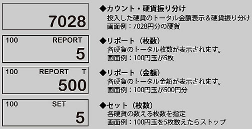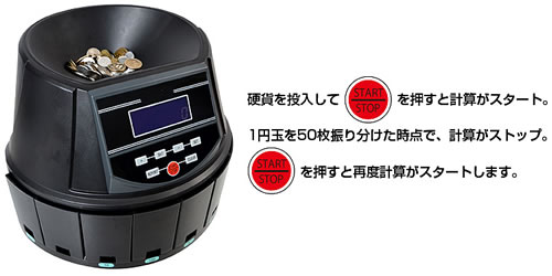 | ■特長 ●使いかたは簡単 硬貨をMAX500枚まで投入し電源を入れる、スタートボタンを押し自動的に金額計算&硬貨振り分け 5円・10円…とあらかじめ硬貨を分けておく必要はなし。大量の硬貨でも、このコインカウンターに投入するだけで自動的に高速で硬貨を選別します。 ![]() ●最大340枚/分でカウント 今までは手作業で時間をかけて行っていた作業も、これがあれば効率が俄然アップします。 ![]() ●各硬貨の枚数や金額をリポート 自動計算後は、わざわざ振り分けた硬貨を数えなくてもOK 「REPORT」ボタンを押すと角硬貨の枚数(金額)を表示します。 ![]() ●リポートを見れば一目瞭然、枚数・金額がすぐわかる。 選別をしながら、各硬貨の枚数・トータル金額を自動計算します。 「REPORT」ボタンを押すだけで、必要なデータはすぐに分かります。 ![]() ●枚数指定も可能 あらかじめ硬貨の枚数を指定しておけます。便利な枚数セット機能を搭載 ![]() ![]() 10円玉を50枚づつ分けたい、といった時に便利な機能付です。 各硬貨の枚数をあらかじめ指定しておけば、硬貨がその枚数に到達する度にカウントがストップ。 必要な硬貨の枚数だけ取り出す事が出来るのです。 ![]() ■サイズと機能 ![]() ![]() ■機能一覧 ![]() ■仕様