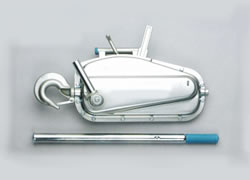 | ■特長 ●小型で軽量 1人で楽に持ち運べるコンパクトタイプです。 ●操作は簡単 前進・後進ともにハンドル1本で操作ができます。 ●自由な角度での作業 タテ・ヨコ・ナナメどんな角度でも安定した作業が行えます。 ●揚程は無制限 ワイヤーロープは引抜式で、どんな長さでも使用でき、遠距離作業も可能です。 ●合理的な設計 二重安全装置付で安心して作業ができます。 また故障の心配がなく、驚くほどの長い寿命です。 ■広い用途