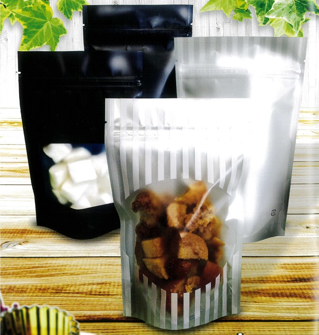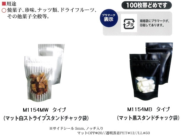 マットOPに白色のストライプ柄を印刷し丸型の窓をつけたM1154MW(白)タイプと黒色を印刷しボックスの窓をつけたM1154MB(黒)タイプ。 商品の中身をしっかりとアピールしながら落ち着いた風合いを表現できるスタンドチャック袋です。 商品を充填すれば、店頭でのディスプレイにも最適です。 |