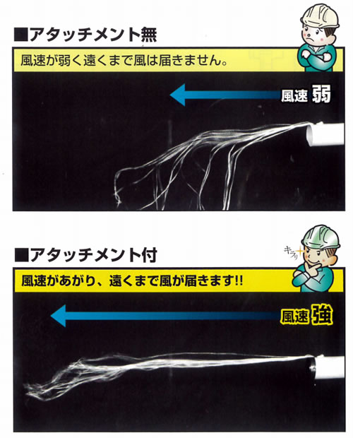 | ■取り付けるだけで風速UP! ●工場などの空調用パイプに取り付けることで空調の風速を上げることができます。 (風速が上がることで、涼しく快適に作業が行えます。) ![]() ■アタッチメント無・アタッチメント付 ![]() ■タイプ