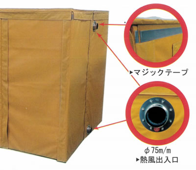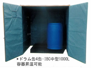 | ドラム缶4本、IBCタンク(中型)1台を保温可能。 保温材は不燃材料認定品 高断熱+超難燃 総重量約25kgと軽く扱い易い!(2.5kg×10枚) ■特長 ●食品材料解凍や建設現場の材料の凍結防止など幅広く利用可能! ●マジックテープで簡単に組み立てる事が可能! ●厚さ20m/mながら保温力はグラスウール50%相当! ●断熱板はポリイソシアヌレートフォームの国土交通大臣認定の不燃材料認定取得品で、独立気泡構造の為、防湿性も高く水が染み込みにくい構造となっています。 ●外装・内装共防炎仕様となっており内側はテフロンコーティングクロス仕様となっていてボックス内で結露が発生しても生地に染みこみません。 ■仕様