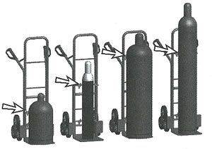 ボンベを支えるホルダーは上下左右に、チェーンの長さを調整することができ、様々なボンベに対応します。 | スチール六輪階段台車ボンベカート 品番 M14A520-FD11E |