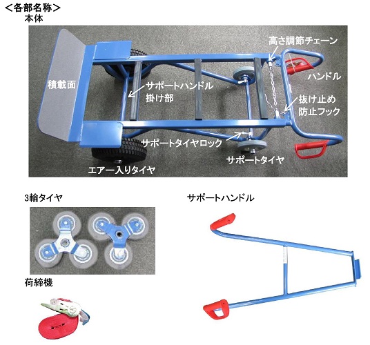 | ■特長 ●サポートハンドルによって段差のある場所でも楽に運搬できます。 ●車輪内側のレバーを倒すとサポートタイヤがロックされます。 ●段差があっても安全に降りることができます。 ![]() ![]() ![]() ■仕様
